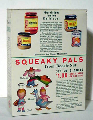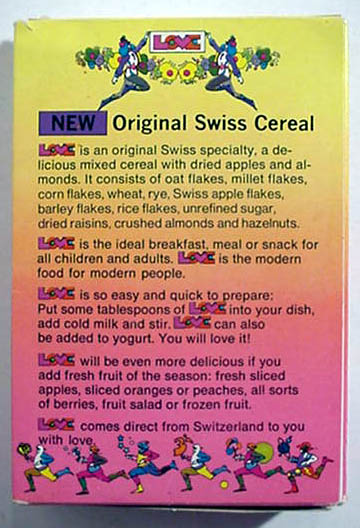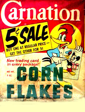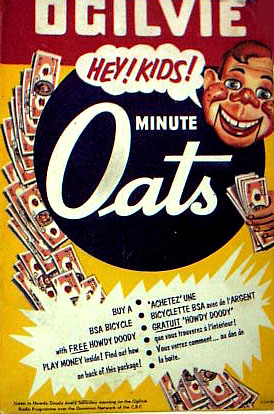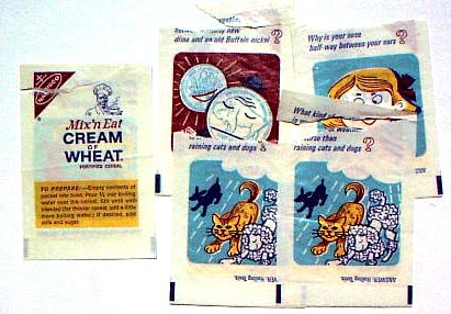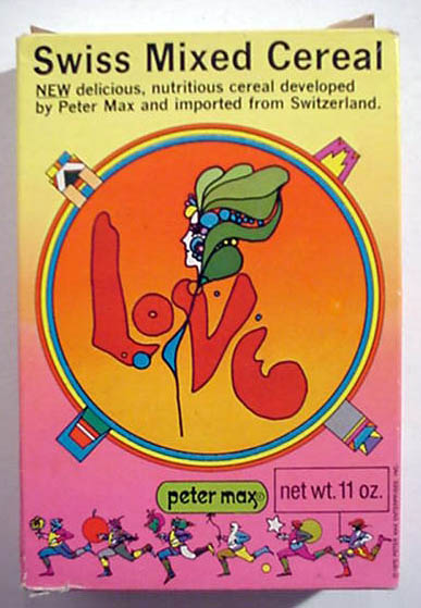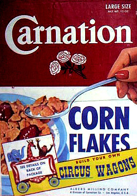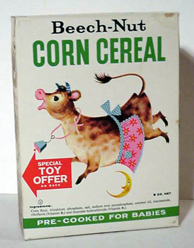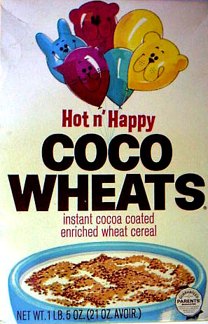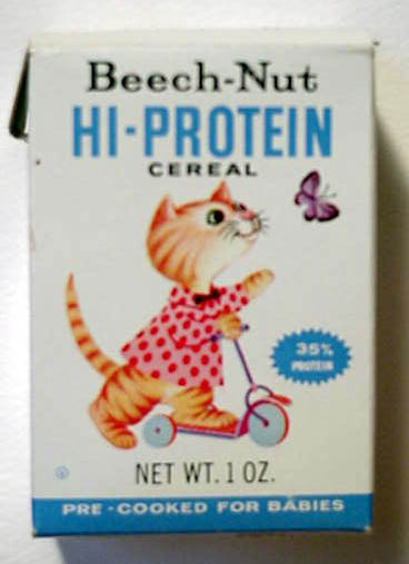BEECH-NUT RICE CEREAL - 1 oz box BEECH-NUT HI-PROTEIN CEREAL - 1 oz box CARNATION CORN FLAKES - front - Circus Model offer CARNATION CORN FLAKES Woody Woodpecker - Cartooning Card inside CHOCOLATE MAYPO - Marky Maypo front - back COCOA WHEATS - front - Dandy the Dragon offer back CREAM OF WHEAT INSTANT - packs with riddles DONALD DUCK 3 MIUNTE OATS - container front - back JAPANESE CHARACTERS CEREAL - front - back MALT O MEAL - front - Flying Saucer offer MAYPO - front Marky Maypo OGILVY OATS (Canada) w/ Howdy Doody - front - back PETER MAX LOVE CEREAL - front - back